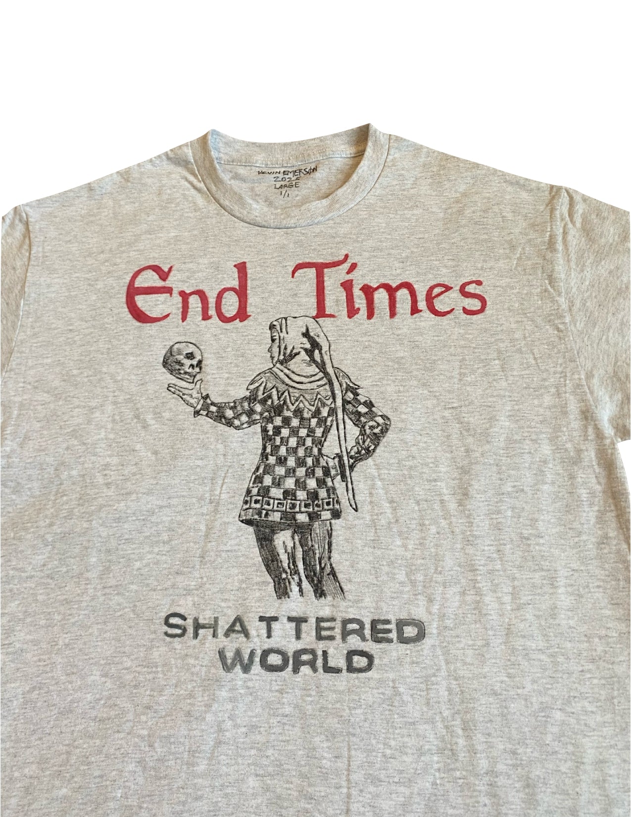 Hand drawn/painted by Kevin Emerson on ash grey American Apparel 1301. Size large