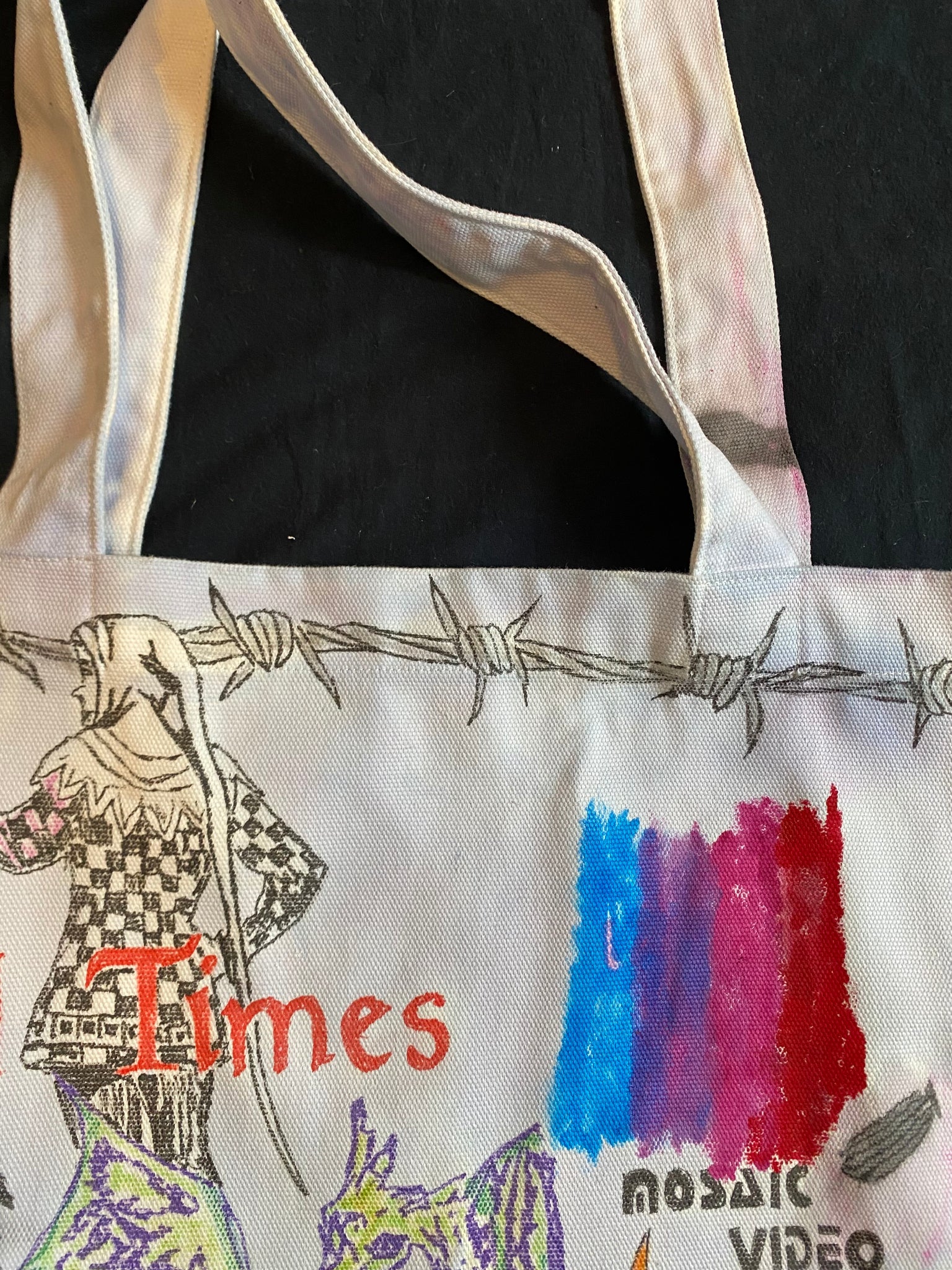 Acrylic, dye and marker on canvas tote, hand painted by Kevin Emerson. 2025